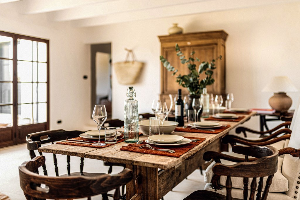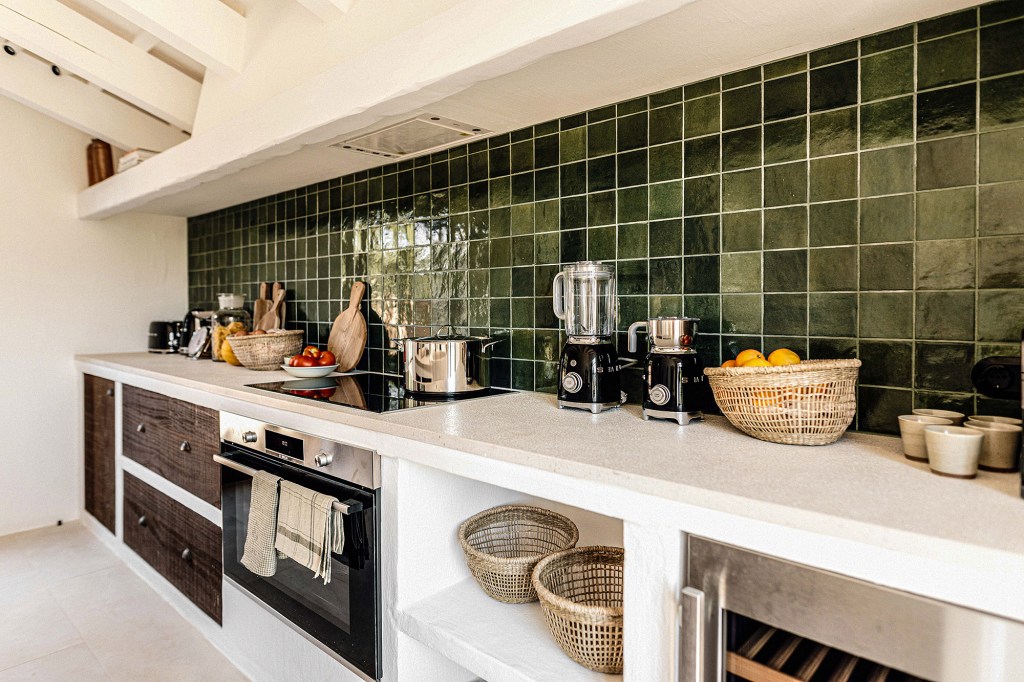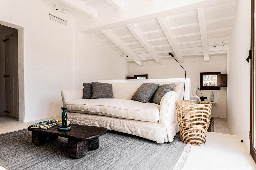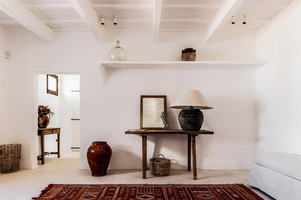 Los interiores de la villa son contemporáneos y sobrios, con paredes blancas, vigas pintadas y obras de arte cuidadosamente seleccionadas. Los muebles de madera, los jarrones de barro, las antigüedades locales y las alfombras texturizadas crean un ambiente acogedor de casa de campo sin comprometer el lujo. El corazón del hogar es la sala familiar, que cuenta con asientos mullidos alrededor de una chimenea crepitante, una rústica mesa de comedor de madera con capacidad para 10 personas y una cocina totalmente equipada con un hermoso respaldo verde salvia.