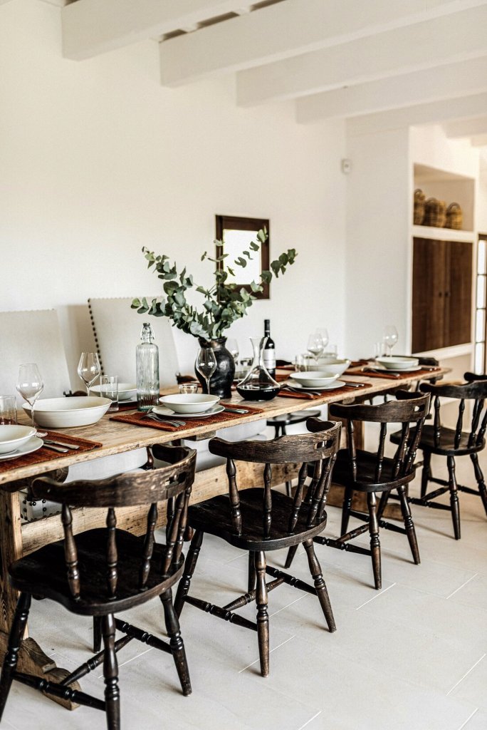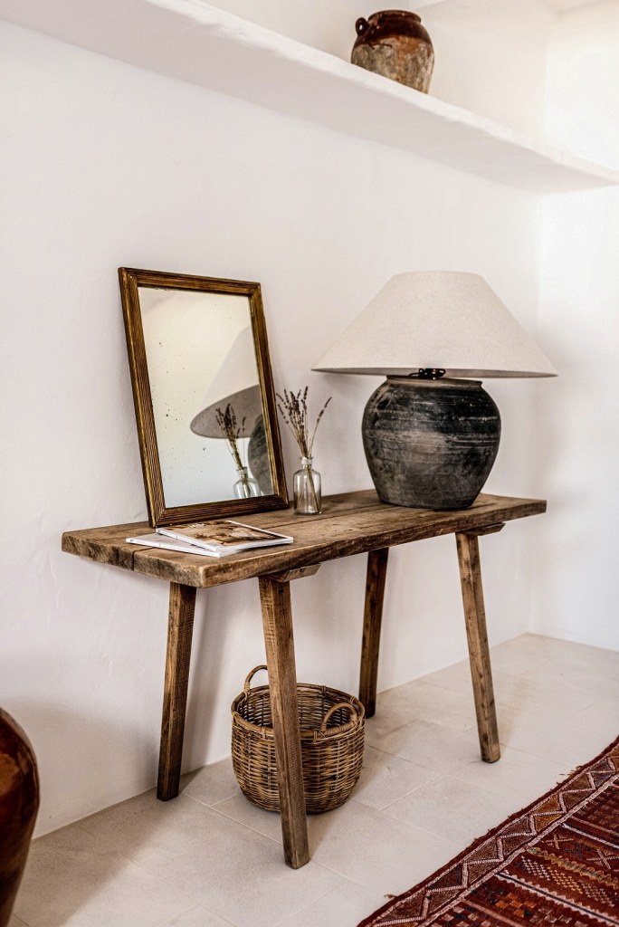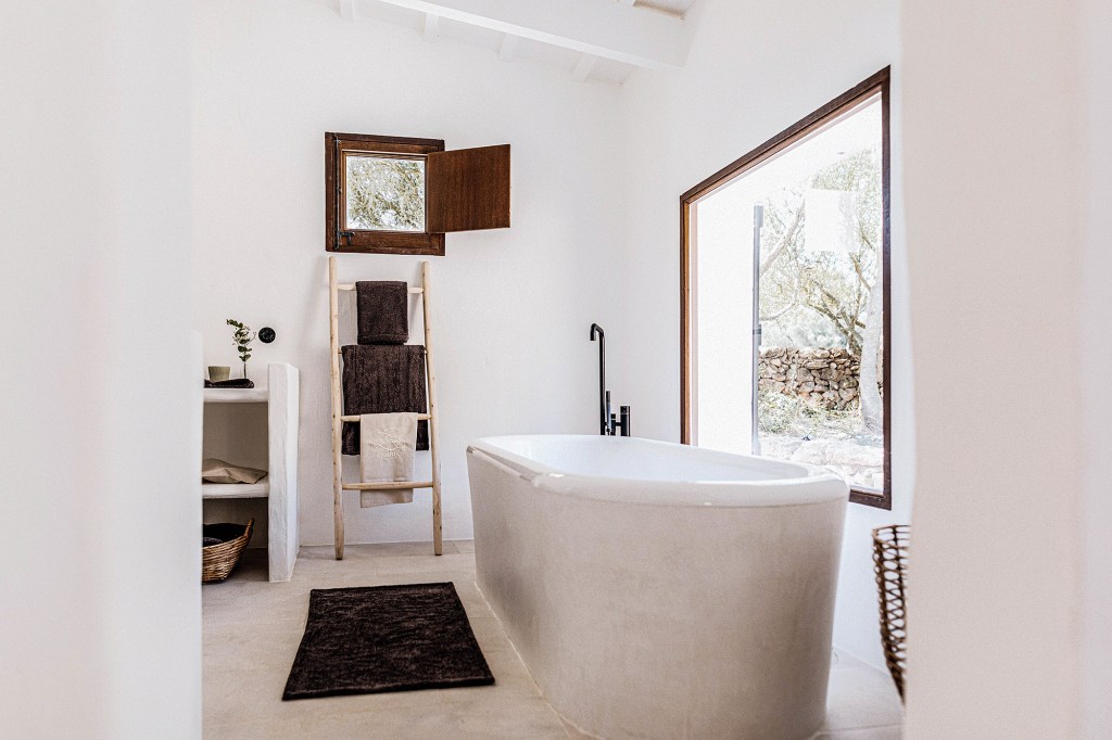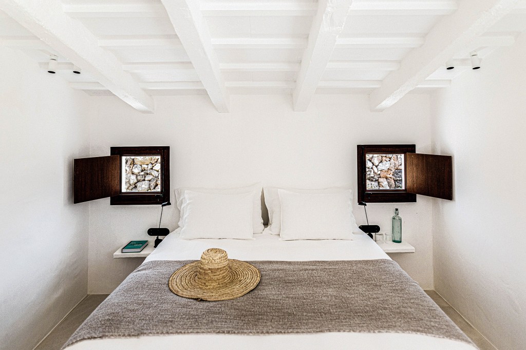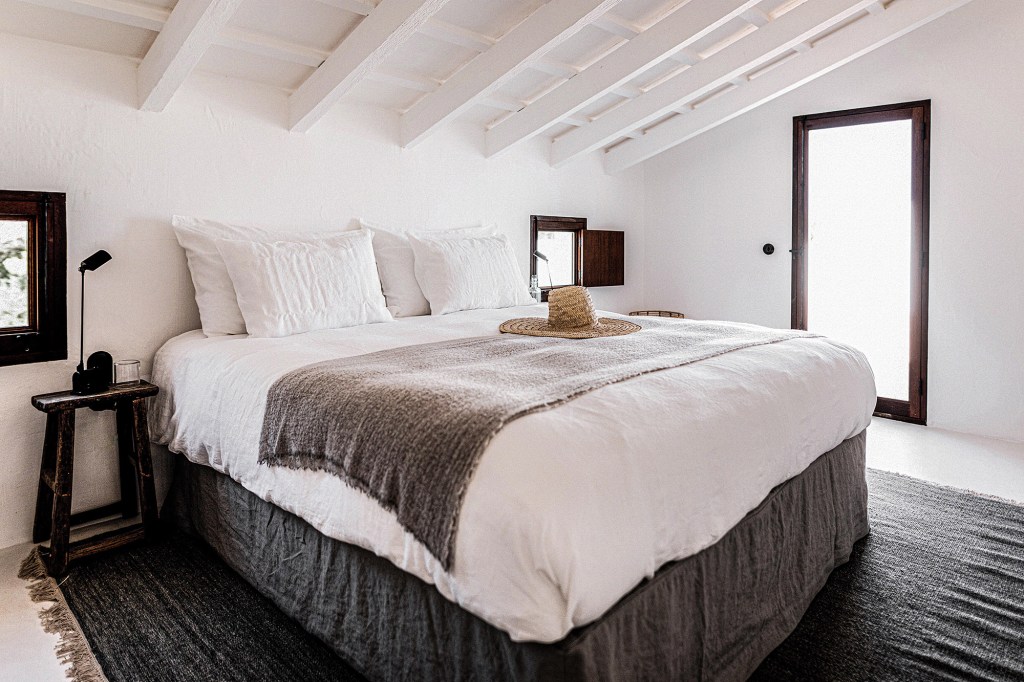 Los interiores de la villa son contemporáneos y sobrios, con paredes blancas, vigas pintadas y obras de arte cuidadosamente seleccionadas. Los muebles de madera, los jarrones de barro, las antigüedades locales y las alfombras texturizadas crean un ambiente acogedor de casa de campo sin comprometer el lujo. El corazón del hogar es la sala familiar, que cuenta con asientos mullidos alrededor de una chimenea crepitante, una rústica mesa de comedor de madera con capacidad para 10 personas y una cocina totalmente equipada con un hermoso respaldo verde salvia.