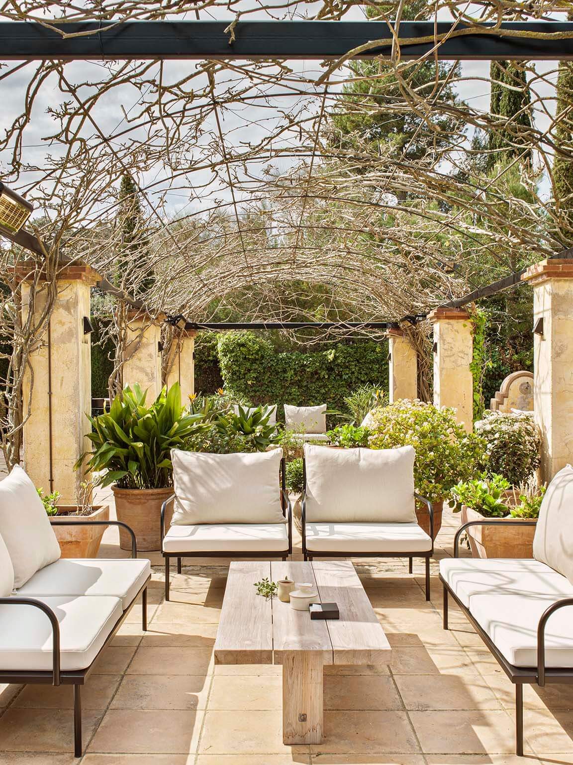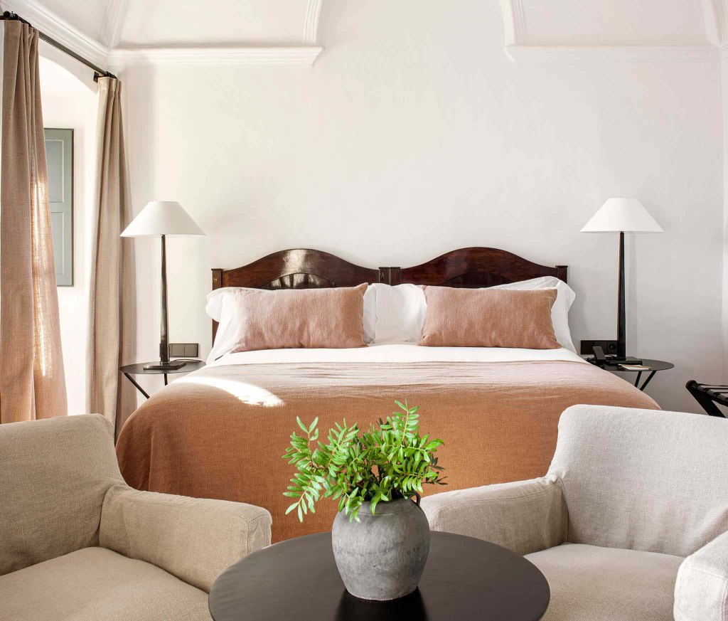 El diseño interior del Mas de Torrent se caracteriza por su atención al detalle y el uso de materiales de alta calidad. Las amplias habitaciones de la masía principal están decoradas con maestría en un estilo clásico, todas diferentes pero amuebladas con antigüedades y alfombras bien elegidas. Las vigas del techo, los suelos de madera y las puertas arqueadas aportan un sabor tradicional junto con lujos modernos como los amplios cuartos de baño de piedra negra y las bañeras. Fuera de la granja se encuentran los bungalows, menos antiguos, pero igual de lujosos, y en medio de los jardines las suites con terrazas y piscinas privadas.