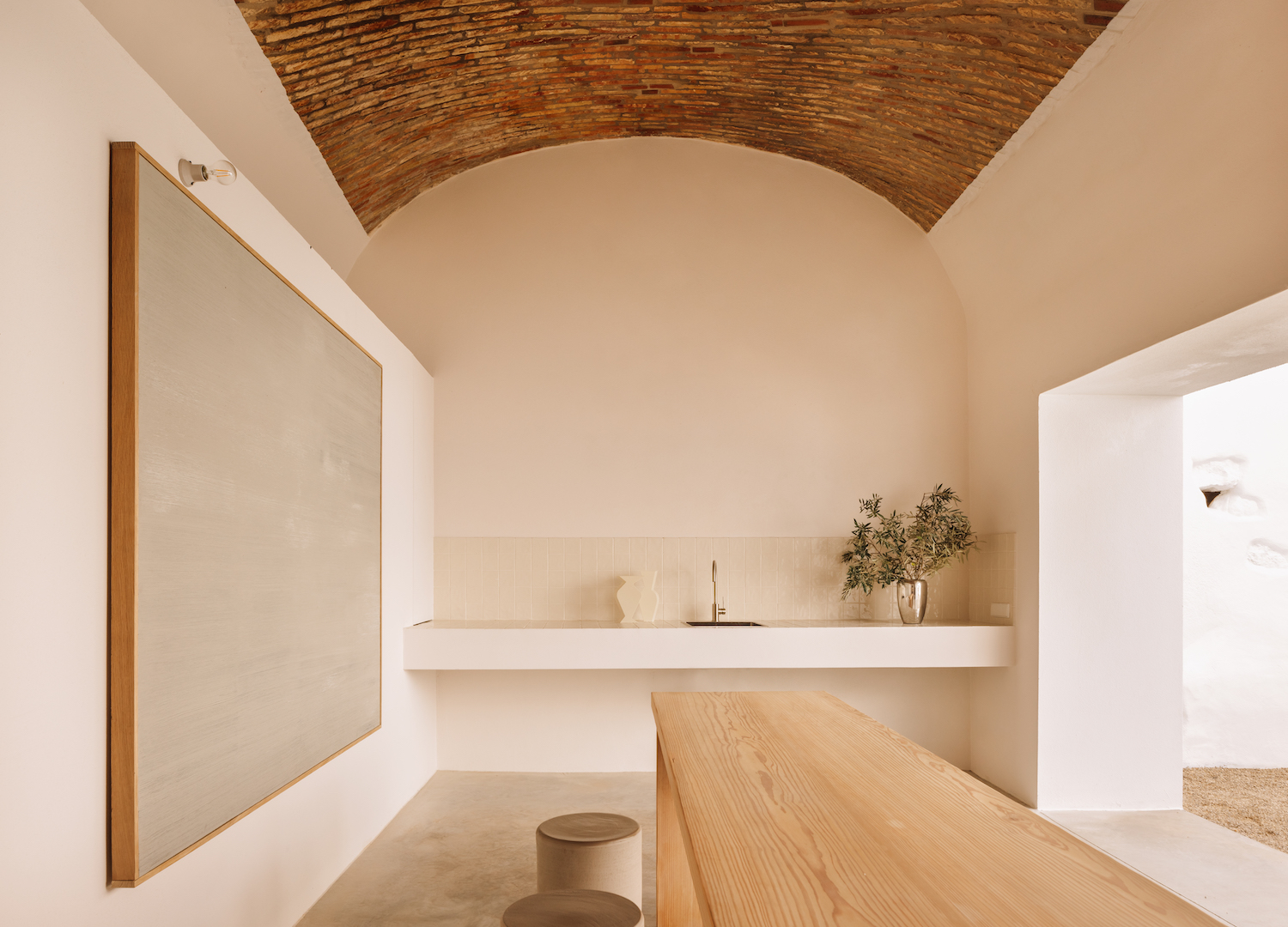 Siguiendo el estilo clásico del Algarve, la casa se extiende en varios niveles, pintado de blanco en el exterior y con un interior suavemente mate y abovedado. La paleta de colores de la casa se basa en una combinación de materiales tradicionales, incluyendo el ladrillo – conservado para los techos interiores – y la cal para las paredes interiores y exteriores. Los espacios también se animan con madera natural, piedra y textiles que aporten un toque contemporáneo. Los muebles, por su parte, coexisten de forma orgánica dentro de volúmenes sin adornos. De la casa emana una elegancia discreta que invita a la relajación. En un patio central se encuentra una piscina y en la azotea una espaciosa terraza donde se pueden apreciar los tejados rojizos del pueblo, el campanario de la iglesia del siglo XVII y varias chimeneas.