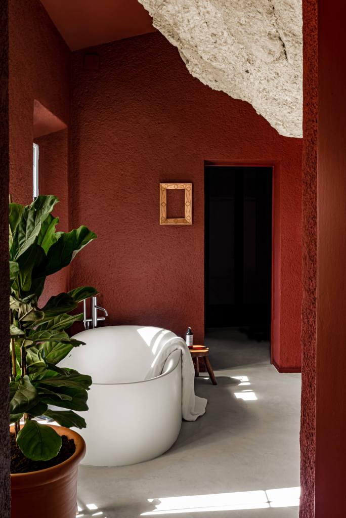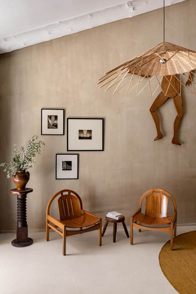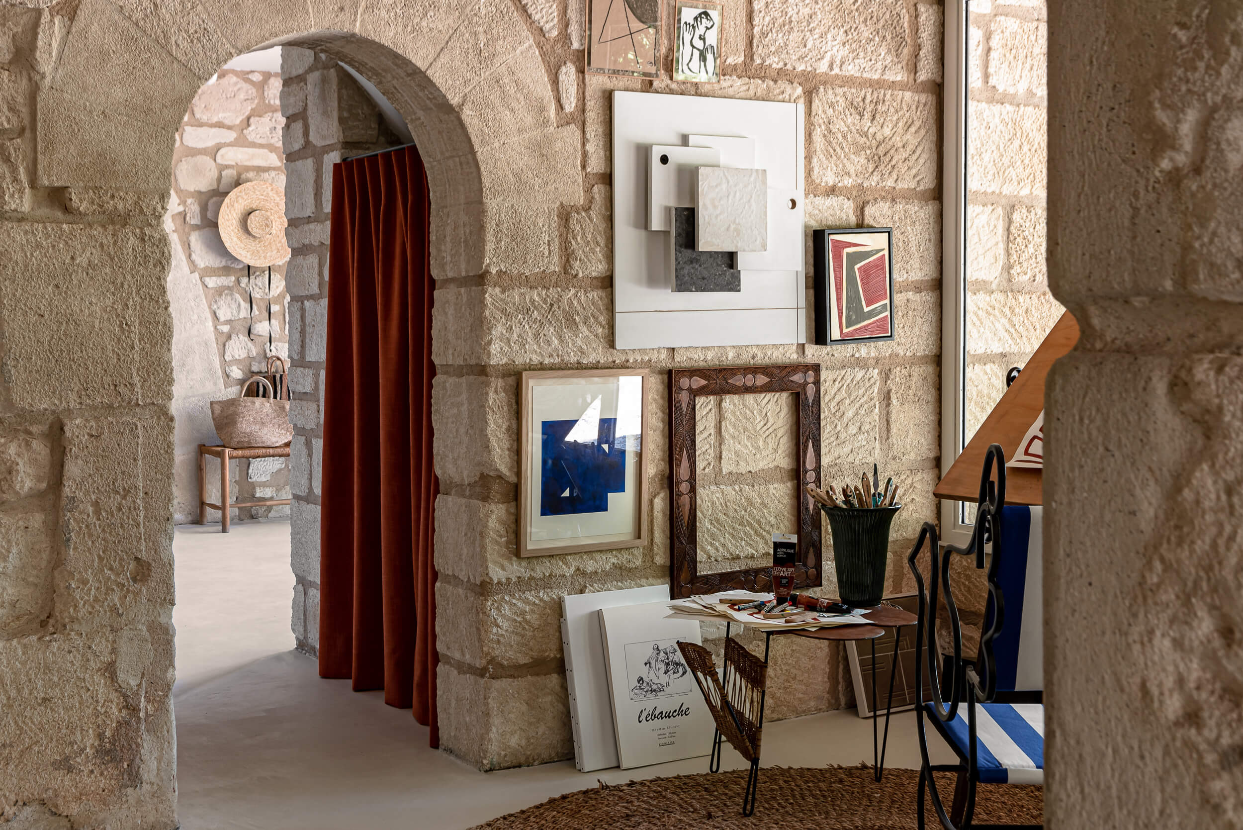 Los interiores cuentan con obras de varios artistas: frescos de la ceramista Florence Bamberger, esculturas de Thalia Dalecky y fotos de Romain Laprade. Además, combinan sin esfuerzo estilos contemporáneos con tesoros vintage, complementados por una cálida paleta de colores y ricos acentos de madera que rinden homenaje al entorno natural y a las canteras históricas de la zona.