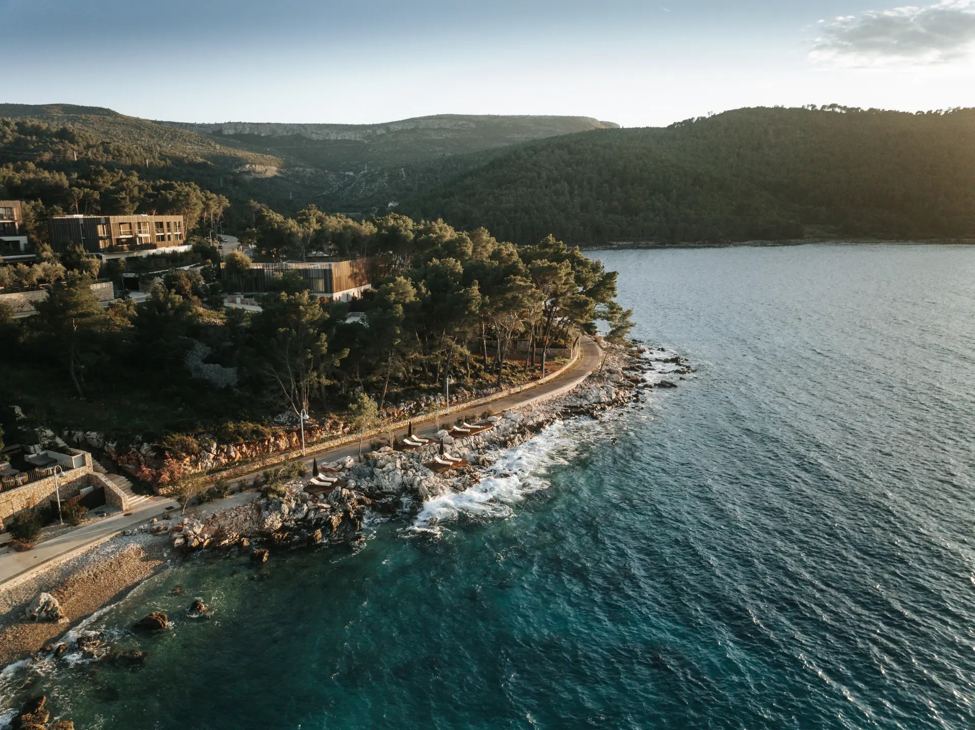 El espacio principal de sala de estar también es luminoso y aireado, con ventanas de piso a techo con vistas al Adriático y una estufa de leña. Si bien los espacios interiores son impresionantes, son las zonas exteriores las que hacen de esta propiedad algo mágico. Con áreas de descanso y comedor para que puedas vivir al aire libre tanto como sea posible, además de un jacuzzi y una piscina infinita climatizada con vistas panorámicas al mar. Para aquellos a quienes les gusta combinar un poco de acción con su relajación, también hay un gimnasio y spa privado en la planta inferior, así como una sauna finlandesa.