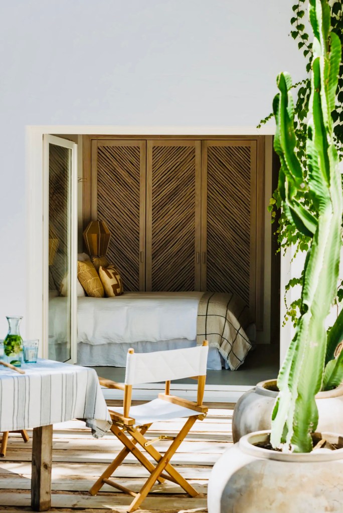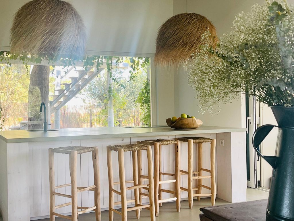 En el interior la casa es elegante y sofisticada, con una gran cantidad de ventanales que inundan los espacios con luz natural. Los suelos son frescos y provocan la sensación de caminar descalzo sobre la arena. La decoración es sencilla pero elegante, con muebles de madera en tonos claros que enfatizan la sensación de luz y espacio abierto.