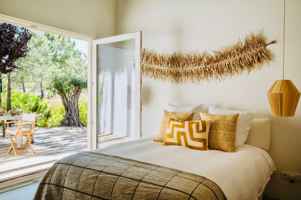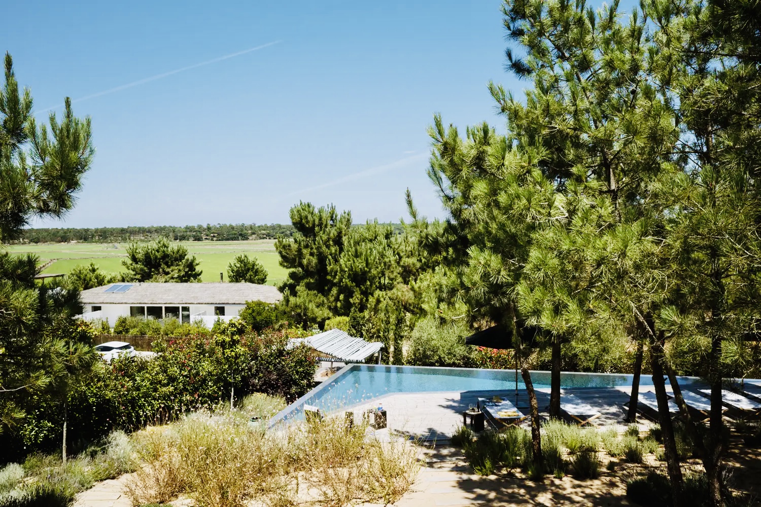 La casa se integra perfectamente en su entorno natural gracias a sus materiales y texturas naturales. El exterior de la casa está revestido de madera y cuenta con amplias terrazas al aire libre donde se puede disfrutar del sol portugués.