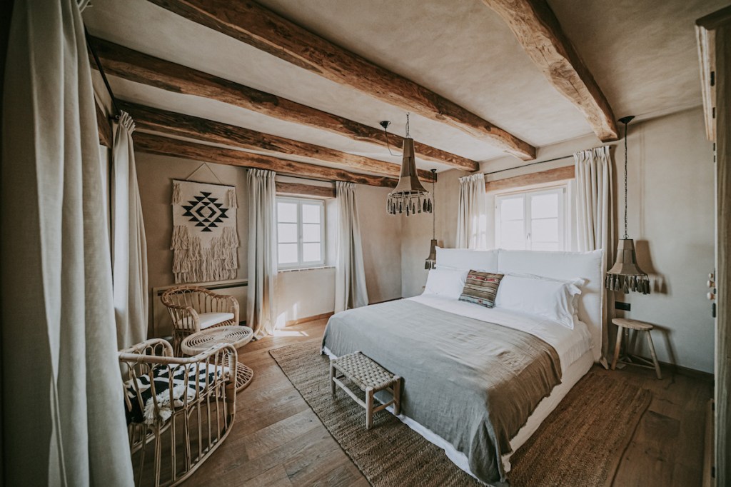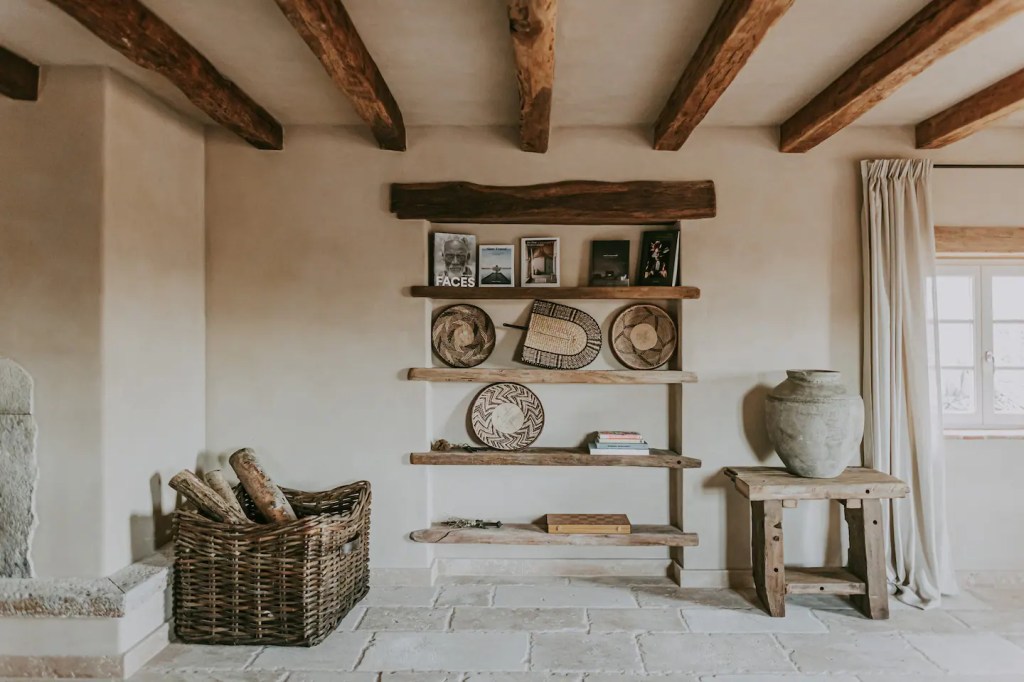 Los elegantes cinco dormitorios de Stanza Vinella cuentan con baño privado. Dispone además de dos salas de estar con vigas a la vista y chimenea. El espacio interior está decorado con materiales naturales y muebles antiguos y artesanía de Asia y África.