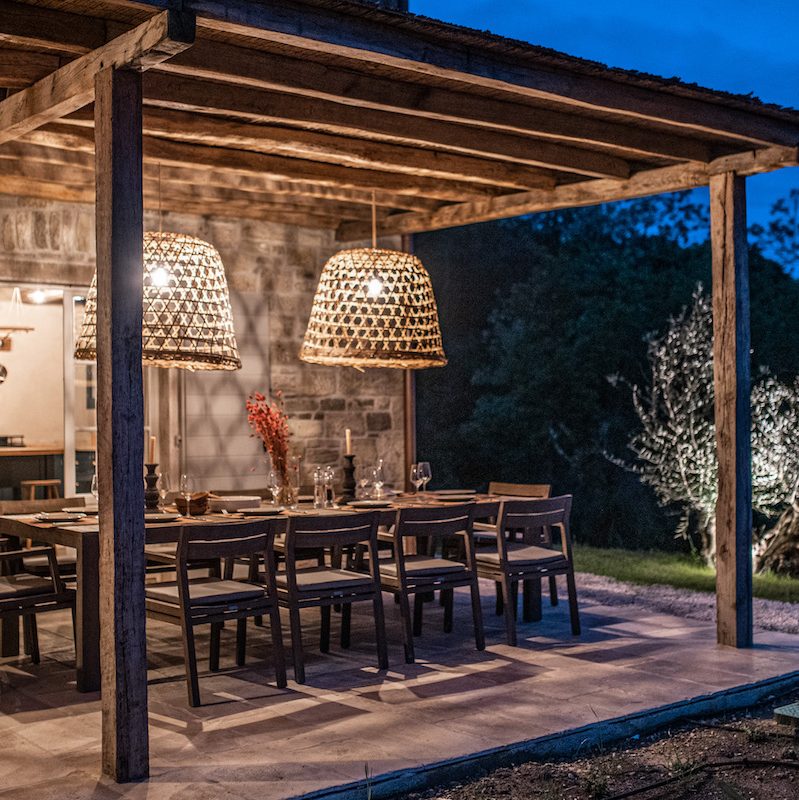 Amplias escaleras conducen de la casa a la piscina, alrededor de la cual encontramos una amplia cocina de verano completamente equipada con terrazas cubiertas, mesa de comedor, sofás y parrilla exterior. La piscina de agua salada infinita tiene impresionantes vistas al valle. El jardín mediterráneo de 60.000 metros cuadrados se completa con campos abiertos, viñedos, olivares, árboles frutales y su propio huerto.