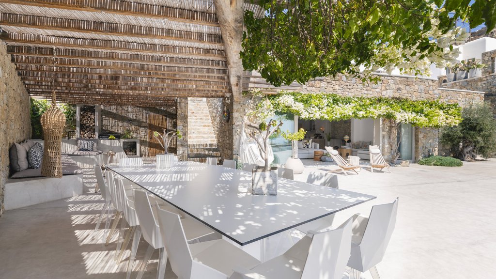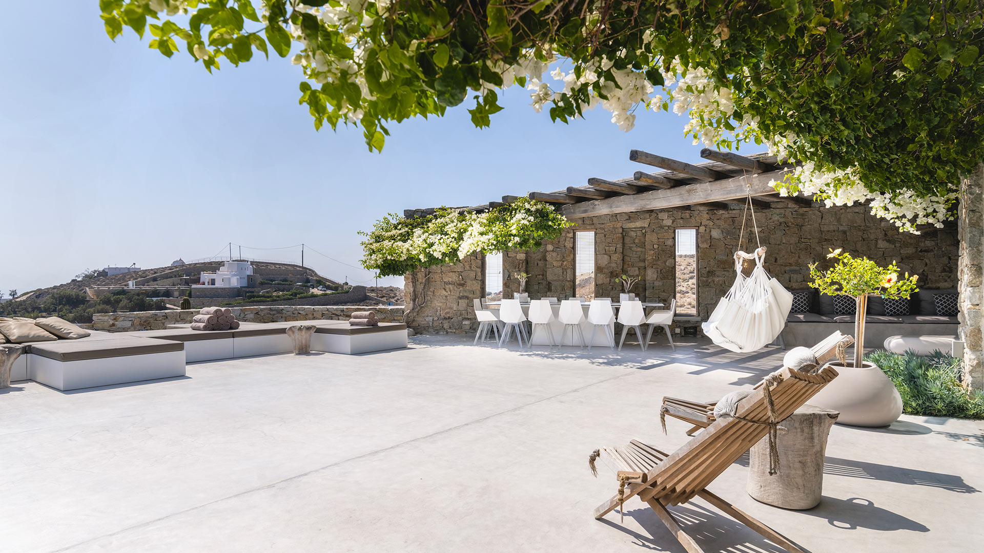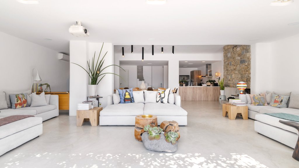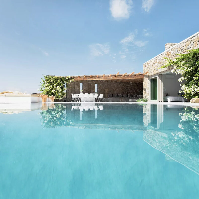 Con su fachada blanca y sus piedras, el minimalismo de Villa Fleur de Sel se integra armónicamente en un paisaje rocoso que refleja los rayos del sol mediterráneo. Esta deslumbrante villa situada en la isla de Mykonos te invita a un espacio abierto e interconectado, donde las vistas panorámicas al mar y las impresionantes puestas de sol cautivarán tus sentidos.
