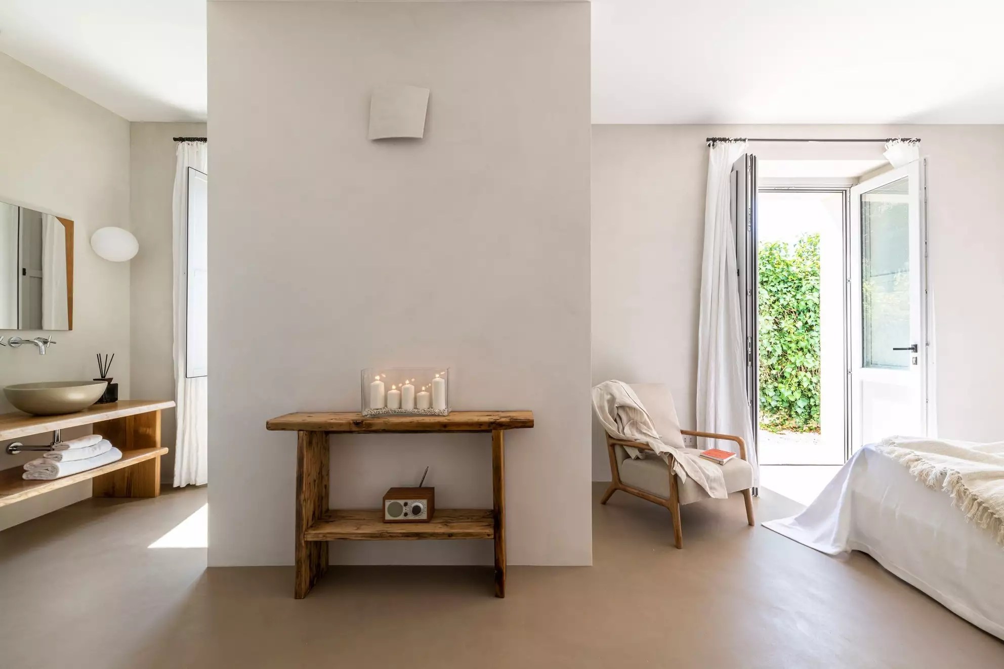 Los textiles y el mobiliario refuerzan esta sensación de confort. Se apuesta por materiales suaves como el lino y el algodón, en colores tierra que complementan la paleta neutra del entorno. Los sofás, amplios y acogedores, son perfectos para relajarse, y las camas, con cabeceros de madera tallada, invitan a descansar bajo la luz suave de lámparas de cerámica artesanal, que añaden un toque íntimo y artesanal.
