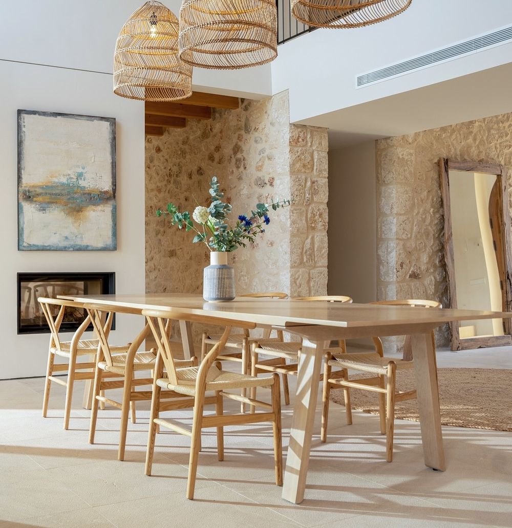 La madera, en tonos cálidos y envejecidos, complementa a la perfección estos elementos. Muebles de cocina con acabados desgastados, vigas vistas en el techo o mesas de comedor de madera maciza son esenciales para aportar ese aire de casa de campo mediterránea. Actualmente, vemos una vuelta a lo artesanal, con muebles hechos a medida y detalles de carpintería que aportan un toque único y personal.
