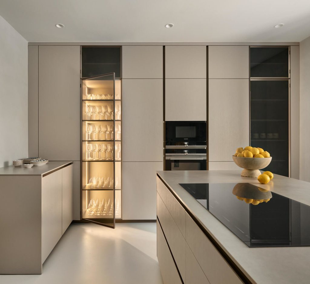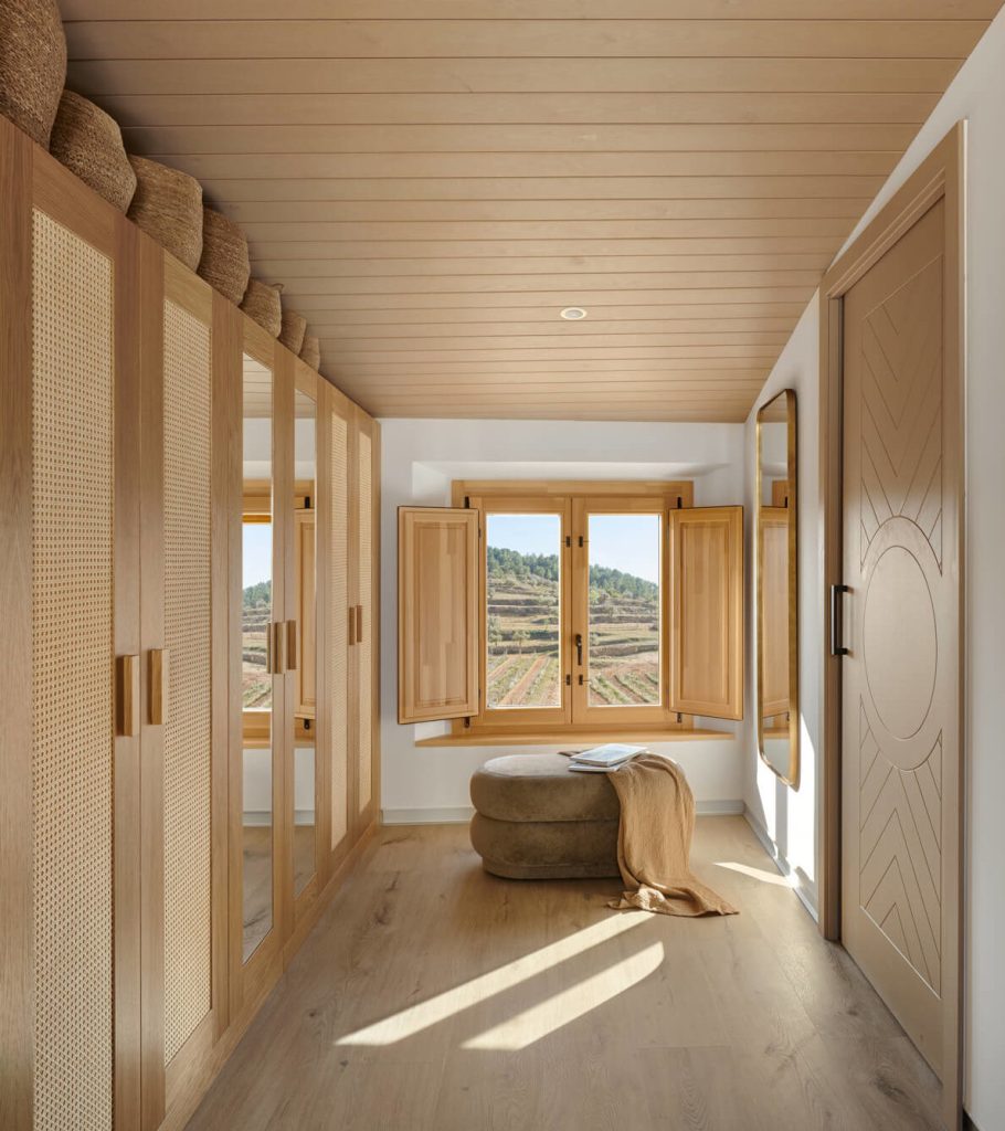 Az épület szívében helyet kapott a Masia Cabellut konyhája, amely tökéletesen illeszkedik az épület letisztult esztétikájához. A Poliform által tervezett konyhabútorok meleg, középbarna fa és greige felületei harmonikusan olvadnak bele a térbe. A konyhapultot egységes, toldásmentes akril munkalap borítja, amely természetes eleganciát kölcsönöz a térnek, miközben kiválóan ellenáll a mindennapi használatnak. A minimalista, fogantyú nélküli szekrények elegáns vonalvezetésükkel remekül kiegészítik az épület rusztikus elemeit. A konyha mellett egy látványos, üvegfalú borospince is helyet kapott.