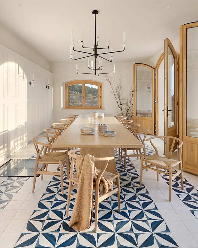 A fa, kő és kerámia dominálnak a Masia Cabellut-ban, és ezek az anyagok bármilyen térbe képesek rusztikus, mégis elegáns hatást hozni. Válassz tömörfa bútorokat egyszerű formavilággal, például tölgy vagy akác anyagból, mint amilyenek a BoConcept vagy Kave Home kollekciói. A padlóhoz használj természetes kőlapokat, például mészkövet, vagy fa parkettát, amelyek tartósságuk mellett textúrával gazdagítják a helyiséget. Ha lehetőséged van, próbálj nagyobb, rusztikus étkezőasztalt beszerezni, ami az étkező központi eleme lehet. - Textúrák és természetes szövetek alkalmazása