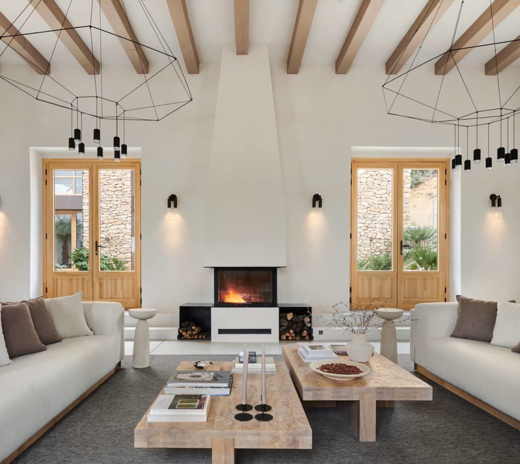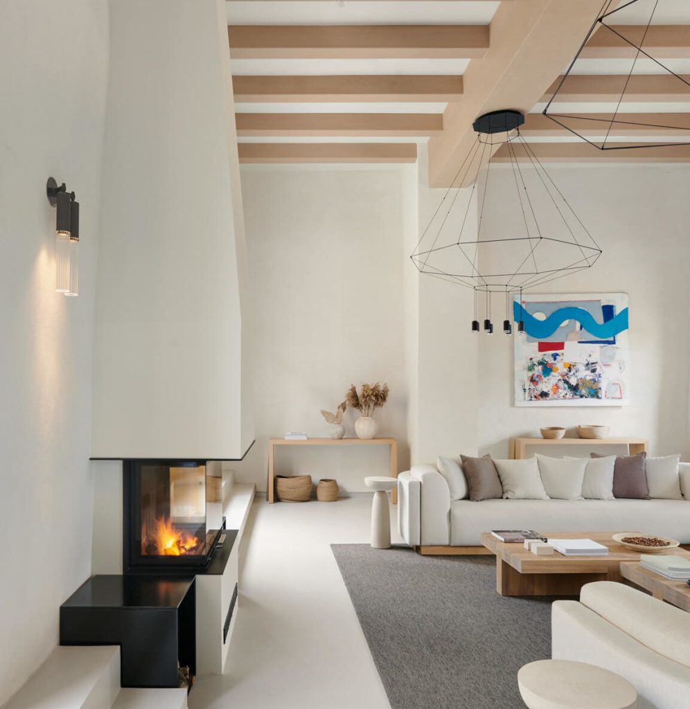 A tágas nappali fókuszpontjában a modern stílusú, beépített kandalló, illetve a mobil-szobrokra emlékeztető, filigrán világítótestek teremtette kompozíció áll. A kovácsoltvas függőlámpák a csillárok esztétikáját egyszerűsíti, finoman kiemelve a formát, miközben erős vizuális jelenlétet teremt. A nagy méretű, texturizált szizál szőnyeg kitűnő alapot szolgál az egyszerű vonalvezetésű, geometrikus kanapékhoz, melyek egymással szemben kerültek elhelyezésre, ezzel is erősítve a tér közösségi jellegét. A márvány kis asztalok úgy töltenek be praktikus szerepet, hogy közben dekorációs elemként is szolgálnak. Az apróbb kiegészítők mint, a fonott tárolók és kerámia vázák szárított mediterrán növényekkel további vizuális érdekességet adnak a térnek.