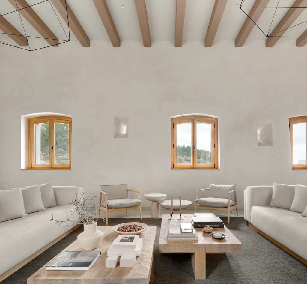 A projekt belsőépítészeti munkálataiban a DomésticoPro és a Matter Barcelona vett részt, gondosan megválogatva az enteriőr dekorációját, hogy az összes helyiség egységes és harmonikus képet mutasson, melynek középpontjában a természetes anyagok, a letisztult vonalvezetés és a dizájner bútorok állnak. Ehhez olyan neves márkák darabjait választották, mint a Carl Hansen, Fredericia, Ethnicraft, Linteloo, Punt Mobles, Ferm Living, HK Living, Vibia, Ethimo és Muuto.