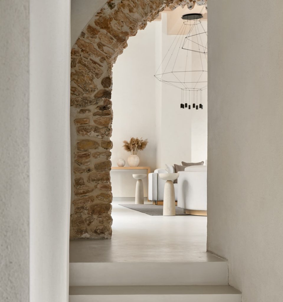 A kézműves kerámiák, vázák és tárolók életre keltik a helyiséget. Válassz natúr színű, mediterrán ihletésű kerámiákat, amelyekben elhelyezhetsz szárított növényeket – például pampafüvet vagy eukaliptuszt – mint amilyeneket a Zara Home kínálatában is találsz. Ezek az egyszerű kiegészítők különösen szépen mutatnak a fa és kő elemek mellett, erősítve az enteriőr természetes, időtálló jellegét. - Fürdőszoba mikrocement burkolattal és letisztult vonalvezetéssel