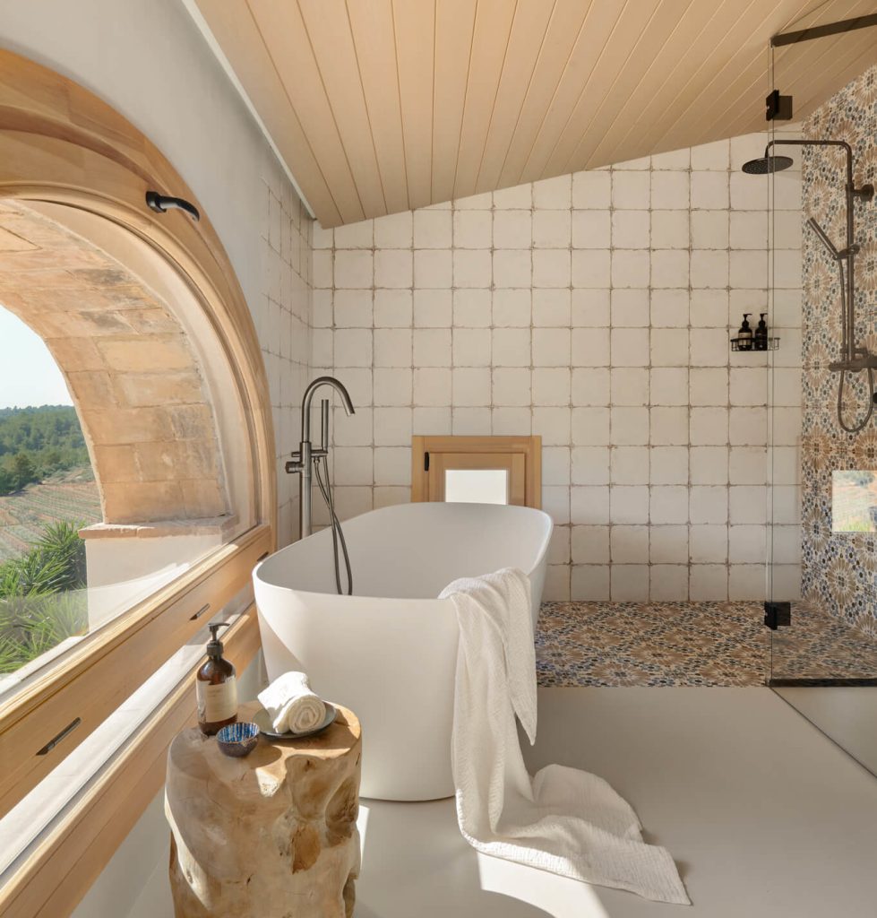 A Masia Cabellut modern, egyszerű, de minőségi fürdőszobai kialakítása mikrocement burkolatot alkalmaz, ami jól illik a rusztikus-modern stílushoz. Ha hasonló hatást szeretnél elérni, fontold meg a cementlapok használatát. A minimalista mosdók és természetes anyagú szekrények mellett helyezz el néhány kő vagy kerámia kiegészítőt, amelyek hangsúlyozzák a tér egyszerűségét és eleganciáját, ugyanakkor kiemelik a mediterrán esztétika lényegét.