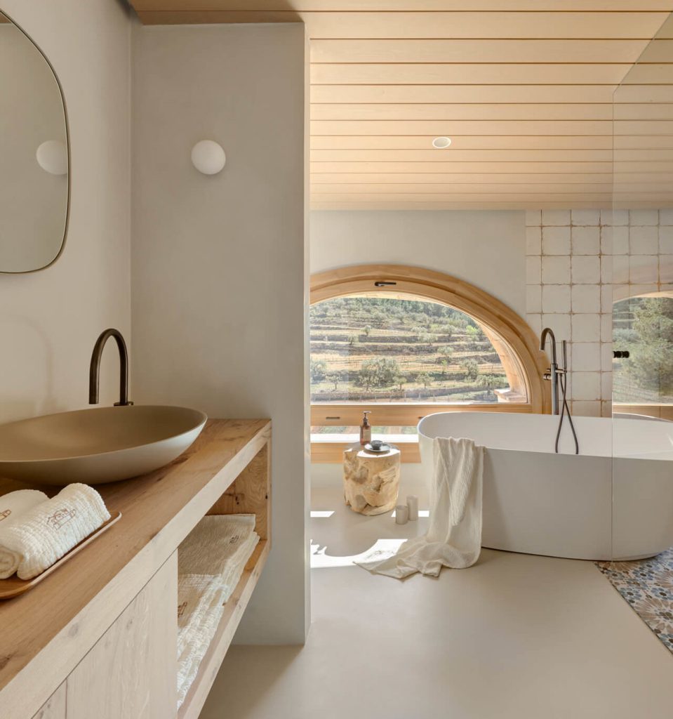 Az ensuite fürdőszobák anyagválasztása szintén a természetességet tükrözi: az egybefüggő mikrocement aljazat és hidraulikus csempék, azaz cementlapok kombinációja adják a burkolatot. A fa szekrények és kerámia mosdók, valamint a szabadon álló fürdőkád tovább erősítik a masia visszafogott eleganciáját, quiet luxury atmoszféráját.