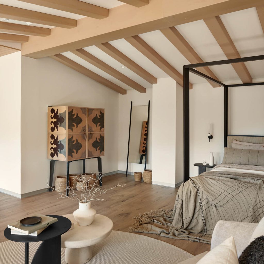 A Masia Cabellut tetőtérben kialakított hálószobái minden részletében átgondoltak: a falak és textíliák színeiben a földszínek dominálnak, mint a bézs, a homok és a világos szürke, amelyek nyugtató, hívogató atmoszférát teremtenek. A helyiség fókuszában egyértelműen a modern formavezetésű kovácsoltvas baldachinos ágy áll, mely érdekes kontrasztot alkot az egyébként kerekded, ovális formákra építő kisebb bútordarabokkal. A hálószoba intim hangulatának megteremtéséhez hozzájárul a könnyed, lenvászon függönyök, illetve a puha, invitáló textíliák.